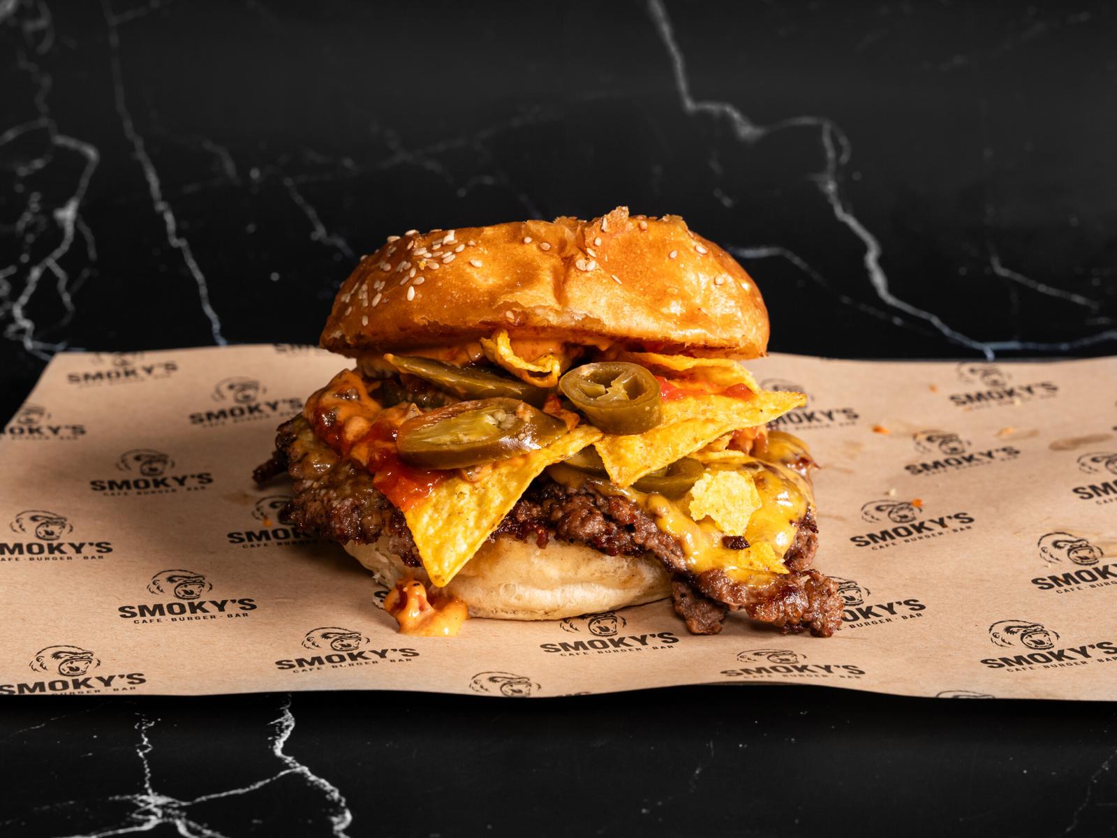 Smashed Beef, American Cheese, Jalapeños, Nachos,